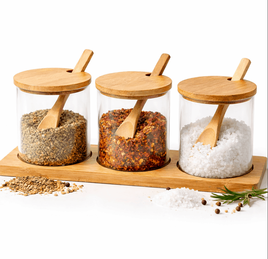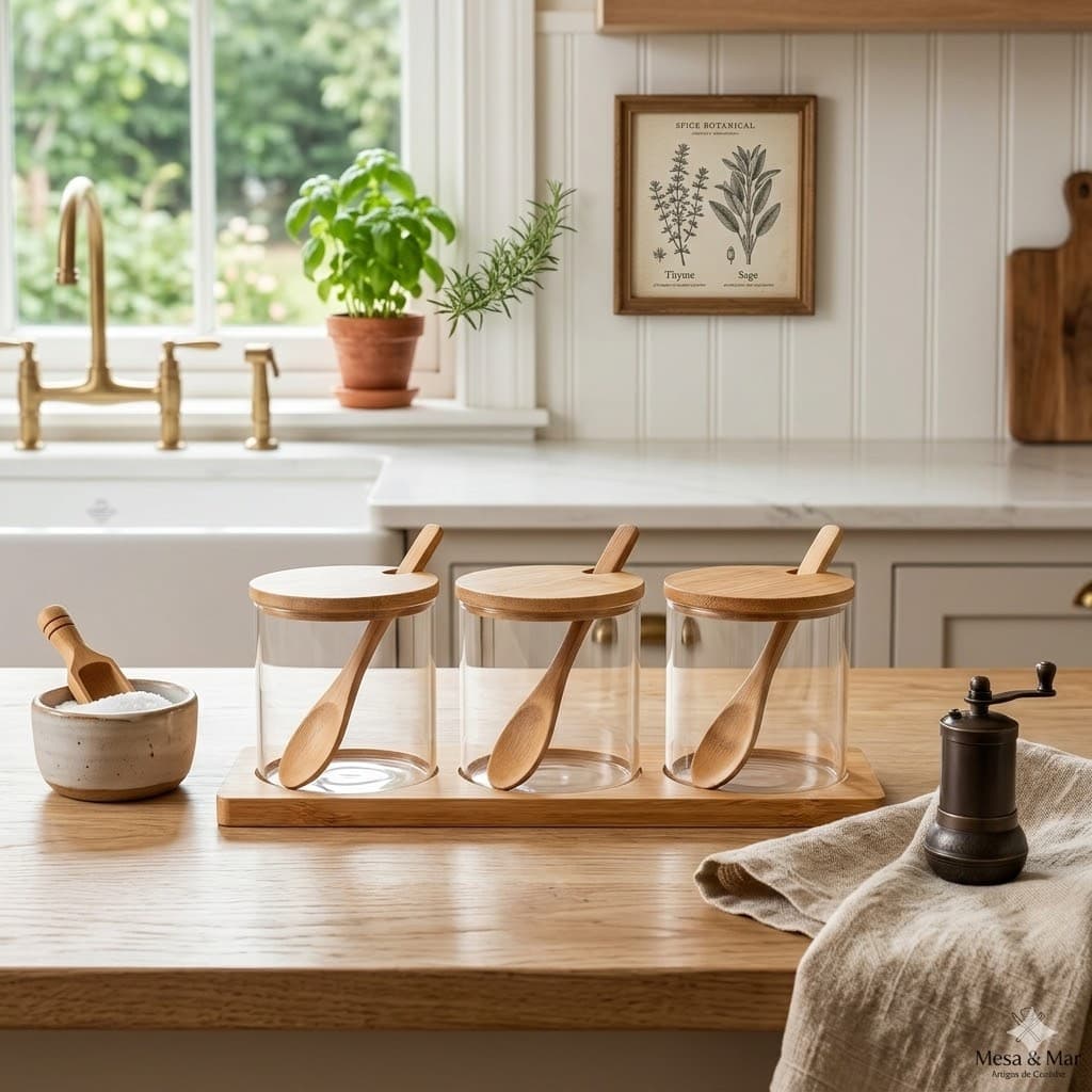 O acabamento em bambu combinado com o vidro transparente cria um visual sofisticado e natural. Dessa forma, o conjunto se adapta facilmente a diferentes estilos de cozinha, desde os mais modernos até os mais tradicionais.