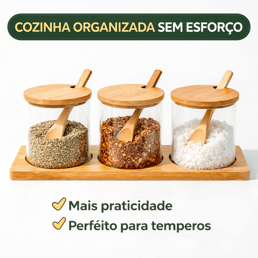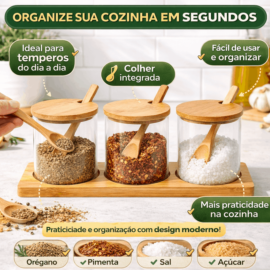 Este kit é perfeito para armazenar diversos tipos de temperos e ingredientes. Por exemplo, você pode utilizá-lo para sal, pimenta, ervas finas, orégano, açúcar e muito mais. Assim, ele se torna um item indispensável para quem busca organização e praticidade.