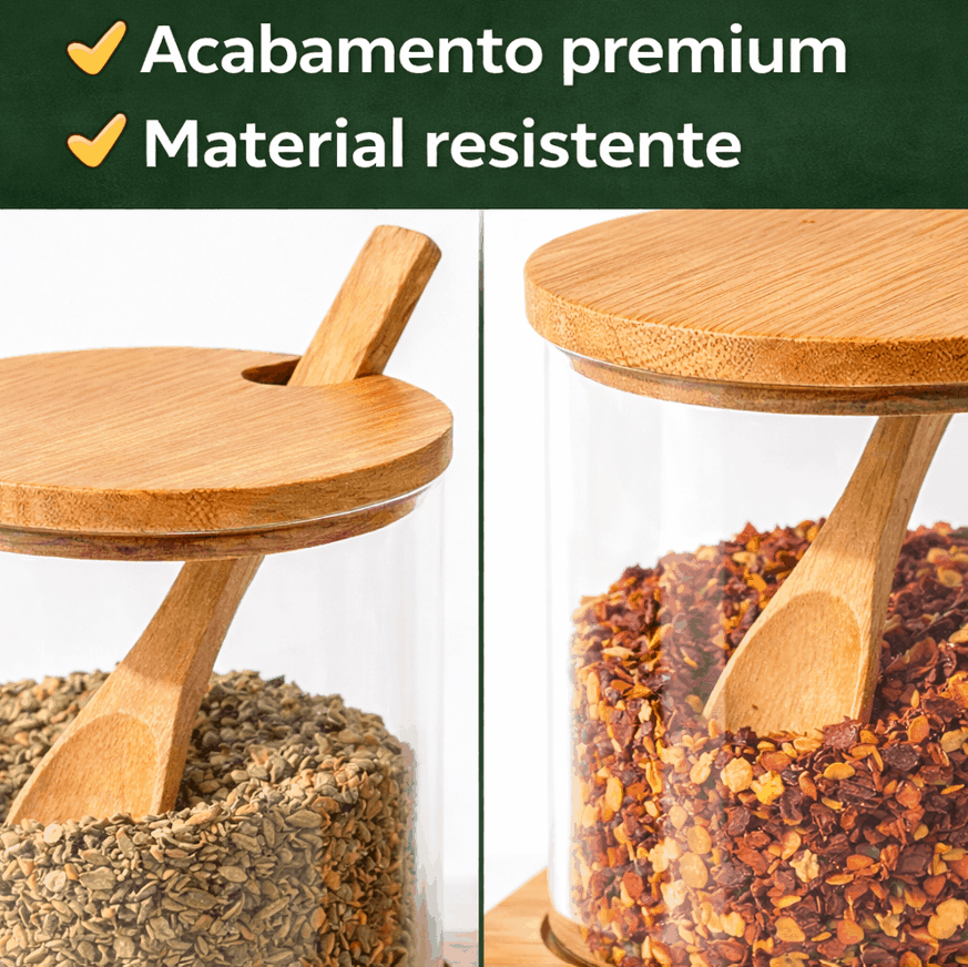 Produzido com vidro de alta qualidade e tampa em bambu, o conjunto oferece excelente durabilidade. Além disso, os materiais são resistentes, garantindo maior vida útil ao produto. Dessa maneira, você investe em um item que acompanha sua rotina por muito tempo.